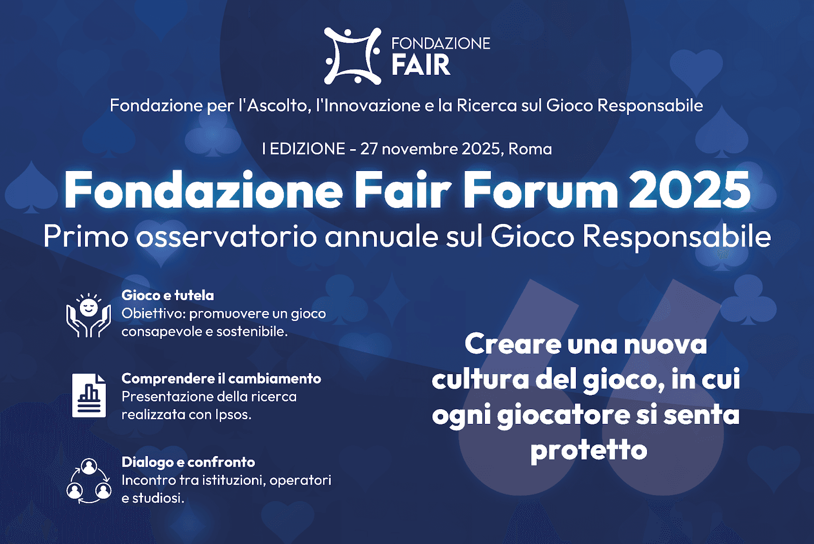 Il 27 novembre, al MoMec di Roma dalle ore 09:30, si terrà il primo appuntamento annuale dell’evento “Fondazione Fair Forum 2025 – Osservatorio annuale sul Gioco Responsabile”, promosso da Fondazione Fair e dedicato al tema del gioco responsabile e alla tutela delle persone. Durante il convegno saranno presentati i risultati della nuova ricerca realizzata con Ipsos, che rappresenta il punto di partenza per un confronto tra istituzioni, operatori e studiosi del settore. L’evento rappresenta un momento di dialogo per condividere esperienze, visioni e strategie sulla tutela dei giocatori e sull’evoluzione delle politiche di prevenzione.